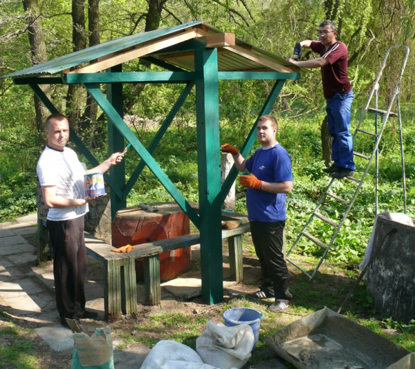 Виконувачка обов’язків Дубинівського сільського голови Марія Заболотна забезпечила добровольців покрівельним матеріалом, цементом, фарбою та щітками. А працівники лісгоспу привезли будматеріали. Впродовж кількох годин молоді чоловіки розібрали старий навіс (точніше те, що від нього залишилося), а потім спорудили нове накриття над столом з лавами, пофарбували.