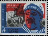 Перша марка, на якій було зображено панцирник «Потемкин», мала номінал 3 копійки і належала до серії «25 лет Первой русской революции 1905-1907 гг.». Автор зображення (яке не цілком відповідало історичній реальності) – С. Новський. Марка була виконана в червоних тонах, 750000 примірників – без зубцівки і мільйон – із гребінчастою зубцівкою.