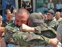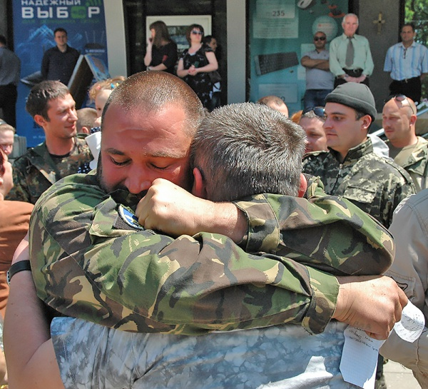 Біля стін адміністративного будинку облдержадміністрації на вулиці Канатній зібралися рідні та близькі бійців, що зустрічали їх квітами, міцними обіймами, палкими поцілунками та слізьми радості.