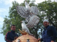 Символическая композиция представляет собой земной шар, на котором, по оригинальному замыслу автора, контурами трех церквей обозначен самобытный городок. Над землей, на раскрытой ладони руки – как символ мира – голуби.
