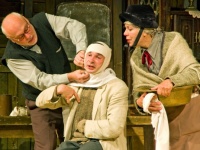 В рамках фестиваля постановка по пьесе знаменитого ирландца «Калека с острова Инишмаан» была самой длинной – более двух часов. Действие в ней разворачивается неторопливо, подробно, буднично, в том же ритме, в каком течет жизнь на заброшенном острове – со скоростью старого скрипучего ветряка в безветренную погоду. В этом бытии мало новостей и почти нет событий. Все заняты привычными делами. Тетушки Эйлин и Кейт готовят лавку к приходу покупателей. Собиратель островных новостей Джоннипатинмайк, он же Пустозвон, пытается обменять свой «драгоценный товар» на что-то более существенное (к примеру, на яйца). Миловидная, но неучтивая Хелен (этакая выросшая, но не повзрослевшая Пеппилотта), как всегда, щедра на тумаки и грубости. Простак Бартли настойчиво ищет среди леденцов «чупа-чупс». А калека Билли сидит на холме, рассматривая коров, хотя его, волнуясь, ждут домашние…