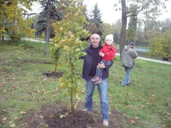 Так было и когда его пригласили в парк Победы для закладки Аллеи Мира. Пришел вместе с дочуркой Александрой, и я сфотографировал их у посаженного ими деревца.