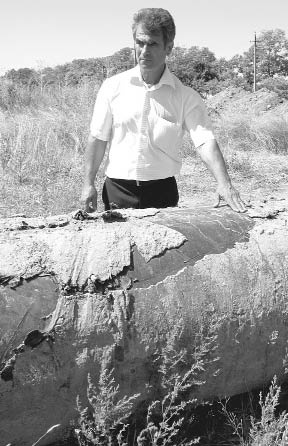 …Коли ми з Іваном Васильовичем Кіронакі прибули на місце пригоди, відтинок чудової за якістю труби лежав у полі. Добротна гідроізоляція зберегла сталь у відмінному стані. Ця труба могла б лежати в землі та служити ще із 30 – 40 років. Неподалік, у лісопосадці, ми побачили «КамАЗ» із номерним знаком ВН 9823 СА. Його навіть не спробували відігнати – треба ж усетаки урвати шматок труби! Судячи зі шматків гідроізоляції в кузові, ця машина останнім часом возила труби, витягнуті із землі. А поруч із насосною станцією стояв екскаватор з номерним знаком 05200 ОК, на борті якого значився напис «Будівельна компанія «Дорсервіс».