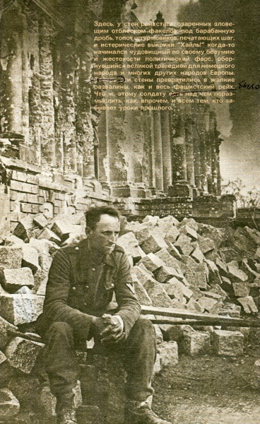 9 травня 1945 р.) боролася Країна Рад за Перемогу й домоглася її ціною неймовірних зусиль і непоправних втрат. Страшний молох війни забрав понад двадцять шість мільйонів життів радянських воїнів і мирних громадян, зокрема близько дванадцяти мільйонів синів і дочок України. Як свідчить трагічна статистика, щодоби в середньому гинуло 19040 чоловік, протягом години – 793 чоловік, за хвилину – 13 чоловік. Приблизно 2 мільйони радянських громадян пройшли через фашистські концентраційні табори. Гітлерівські окупанти дощенту зруйнували й спалили 1710 міст і селищ, 70 тисяч сіл і хуторів, 32 тисячі промислових підприємств. 25 мільйонів чоловік, які дочекалися світлого Дня Перемоги, залишилися без даху над головою.