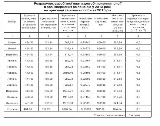 Зп = 2368,70 грн х (0,25746 + 0,24979 + 0,23182 + 0,23767 + 0,22652 + 0,20105 + 0,22393 + 0,22972 + 0,21698 + 0,21456 + 0,22229 + 0,19813) : 6 (страховий стаж за місяці, які враховано для визначення коефіцієнта заробітної плати (доходу) застрахованої особи) = 2368,70 грн х 0,45165 = 1069,82 грн.