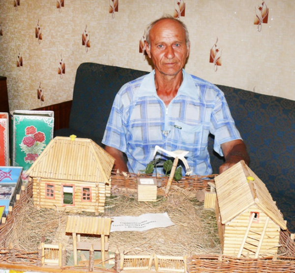 Спробував працювати і з іншими матеріалами, зокрема зі стержнями сорго. Найулюбленіша композиція – макет українського подвір’я.