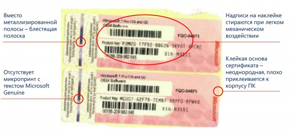Ресурси, які поширюють фальшиві наліпки, заявляють, що вони справжні, але ретельний аналіз виявив низку відмінностей. Так, замість металізованої – блискуча смужка, на якій відсутній мікропринт із текстом «Microsoft Genuine». Написи на наліпці (OEM Software, назва продукту, ключ активації та номер ліцензії) стираються при легкому механічному впливі. Основа фальшивого сертифікату – неоднорідна і погано приклеюється до корпусу комп’ютера. Крім того, деякі зразки мають ознаки повторного використання.
