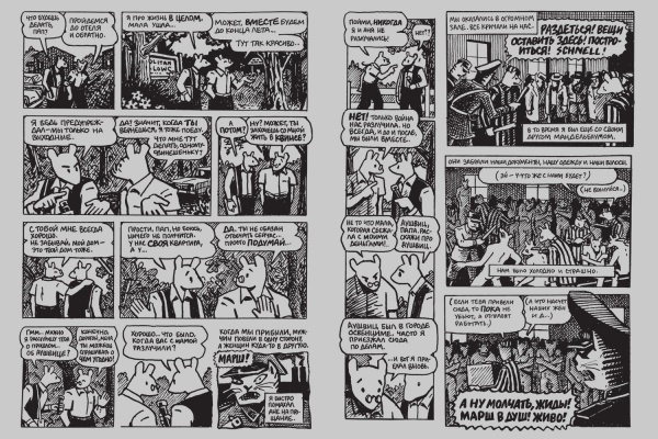 Проблему расизму й антисемітизму позначено вже в епіграфі першої частини словами Гітлера: «Євреї, безсумнівно, – раса, але вони не люди». Дискримінація та приниження людської гідності були в концтаборі повсякденними. Шпігельман-старший згадує: «Інші полонені одержували їжу два рази на день. Ми ж, євреї, отримували лише скоринку хліба і трохи супу».