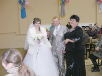 Великою несподіванкою для всіх стала поява в залі наречених у весільному вбранні – молодята Олександр та Наталія Гілко того дня поєднали свої серця, тож закономірно стали наймолодшою подружньою парою та отримали від селищного голови квіти і подарунок.