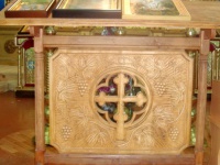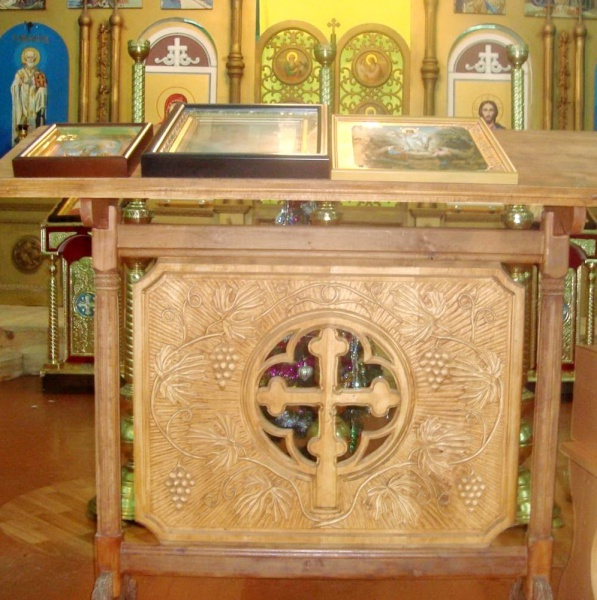 Видно, що аналой зроблено майстерно, з фантазією. Хрест розміщено у колі. Від нього увсебіч відходять сонячні промені. Здається, що від аналоя віє теплом…