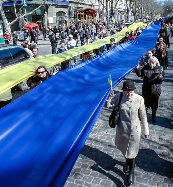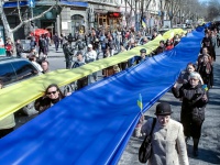 У неділю прихильники єдності України пронесли вулицями обласного центру дві довгі стрічки жовтого і синього кольору, які символізують Державний прапор України.