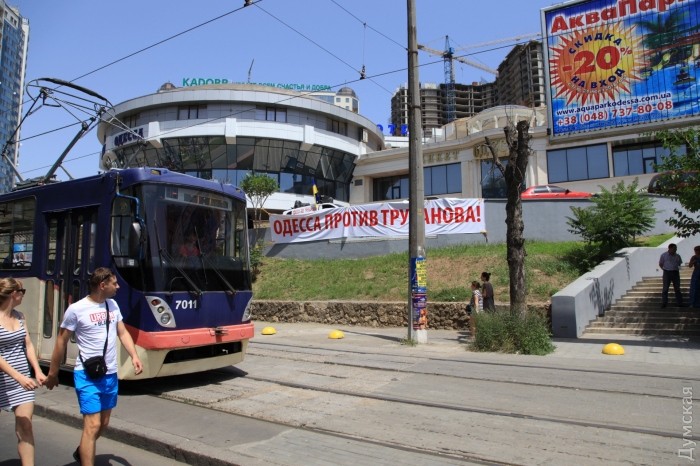Участники вышли с плакатами и транспарантами и вывесили портреты Труханова на мусорных баках. Для своей акции пикетчики перекрыли огромным баннером въезд на улицу Посмитного со стороны Аркадии. Полиция также перекрыла движение и со стороны Фонтанской дороги, в результате чего образовались огромные пробки на всем Фонтане.