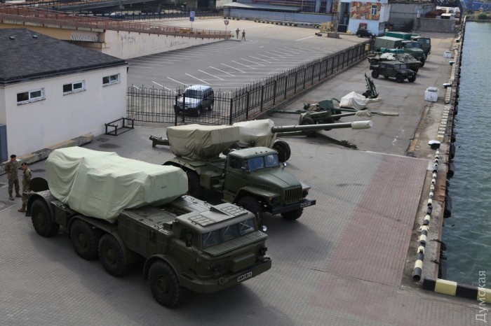 На стоянке у причала № 20 обнаружена боевая колесная техника: грузовики, пушки, система «Град», «Хаммер» и еще несколько единиц техники, которые будут участвовать в показе в День ВМСУ.