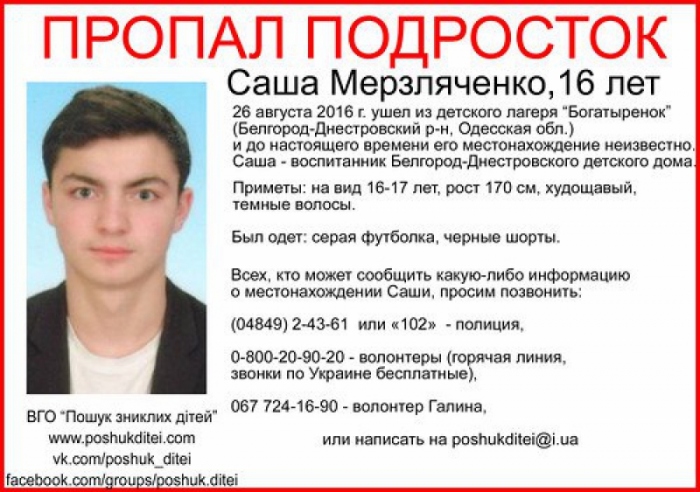 Волонтеры и полиция разыскивают 16-летнего Александра Мерзляченко, который 26 августа ушел из детского лагеря «Богатыренок» в Белгород-Днестровском районе и до сих пор его местонахождение неизвестно.