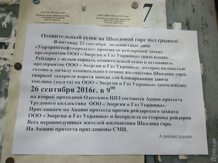 По словам генерального директора ООО «Энергия и газ Украина» Александра Годлевского, сейчас отопительный сезон микрорайона Шкодова гора, где проживает 300 семей, находится под угрозой. 23-го сентября сотрудники ГП «Укртранснефтепродукт» заварили ворота на второй проходной ООО «Энергия и газ Украина», которое обеспечивает теплом микрорайон. Предприятие теперь не имеет возможности запустить котельную.