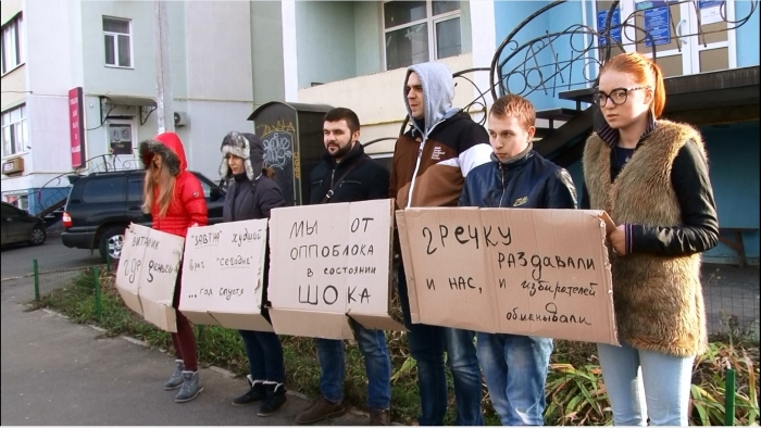 Под стены офиса приемной народного депутата Николая Скорика молодые люди пришли с обычными картонками – чтобы не тратить и без того недостающие средства на полиграфию. «Мы от Оппоблока в состоянии шока», — гласит один из лозунгов.