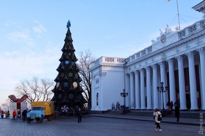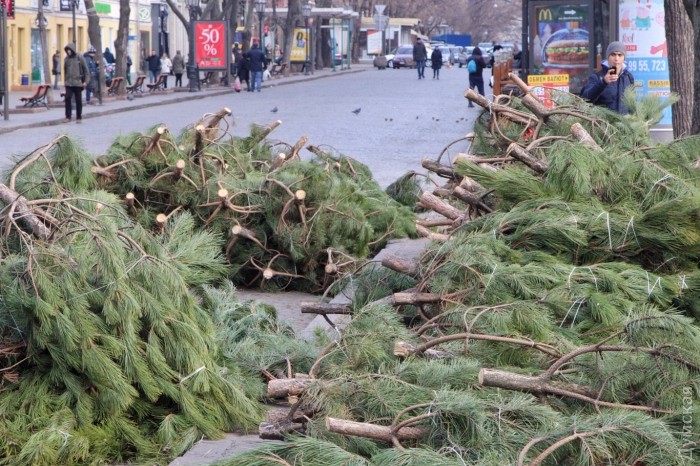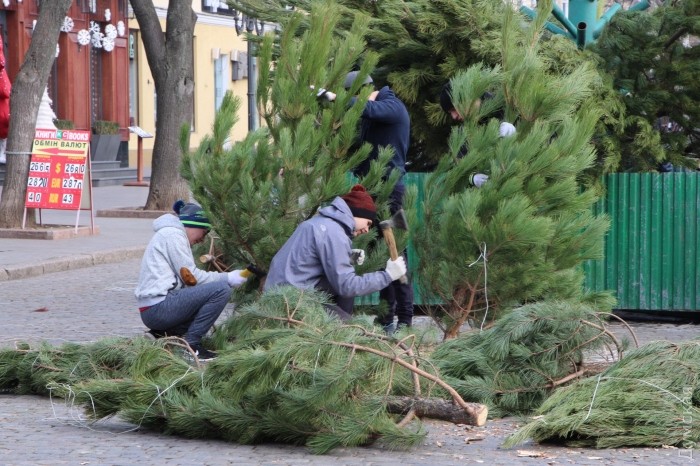 В отличие от искусственного хвойного возле мэрии, ель на Дерибасовской будет «живой»: ее собирают из нескольких десятков сосен, срубленных в питомнике. Любопытно, что последних отсутствуют обязательные наклейки со штрихкодами.