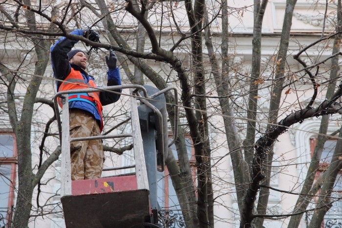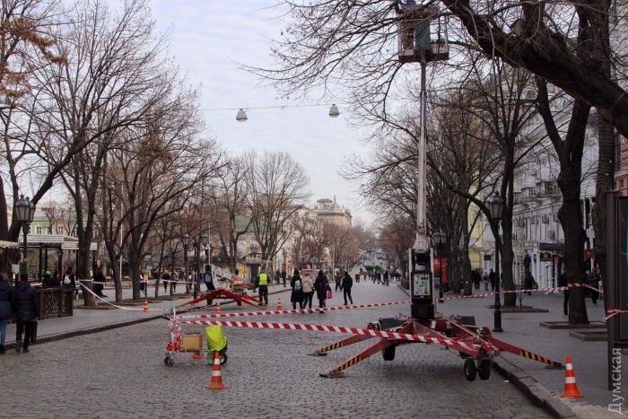 На деревьях, растущих по бокам улицы, работники «Горсовета» вешают гирлянды. Сотрудник, с которым пообщался наш корреспондент, пообещал, что праздничная иллюминация украсит участок Дерибасовской от Преображенской до Ришельевской. Закончить обещают к Новому году.