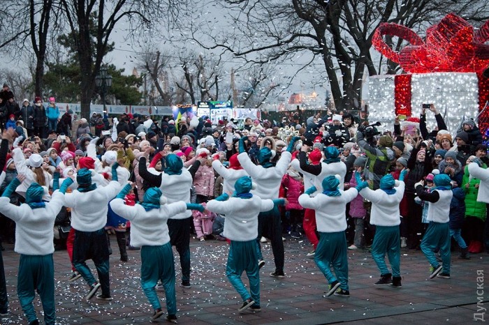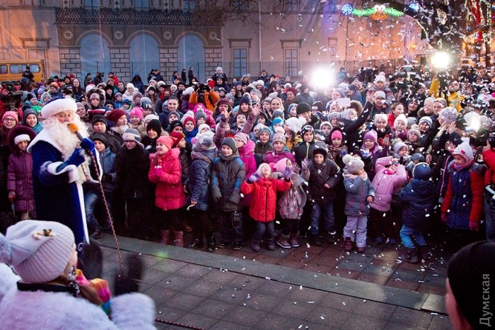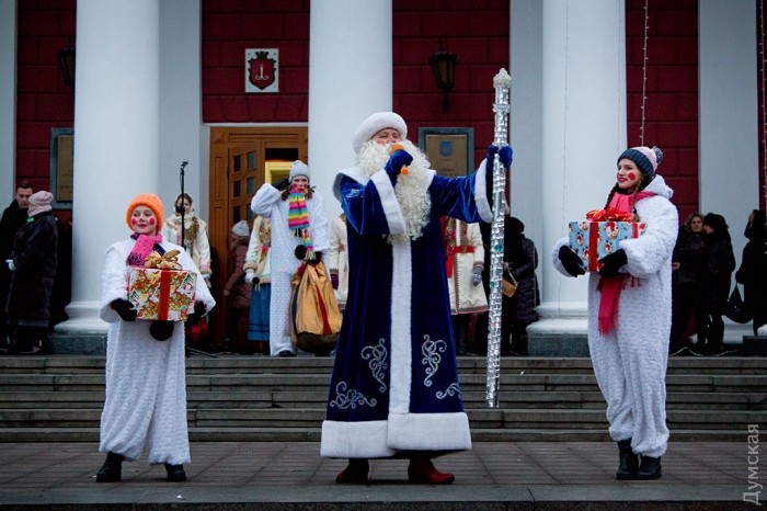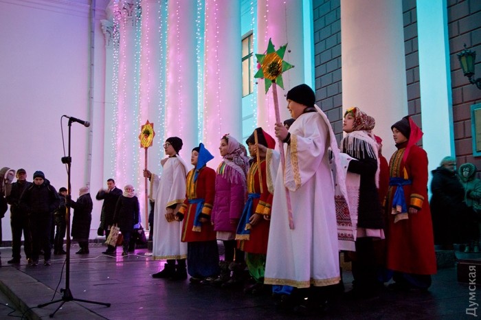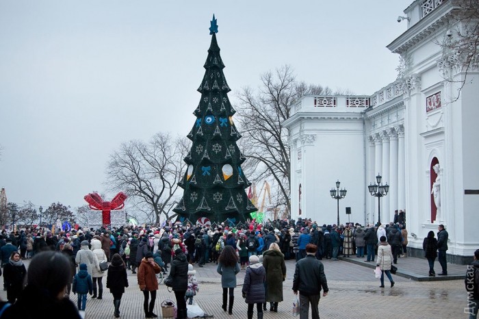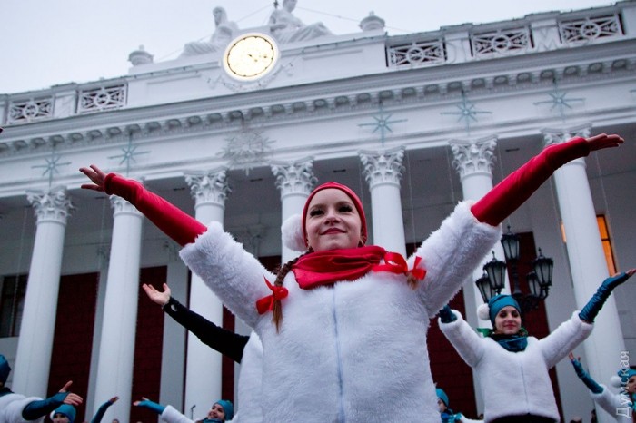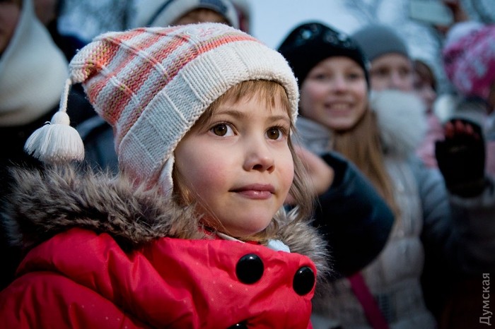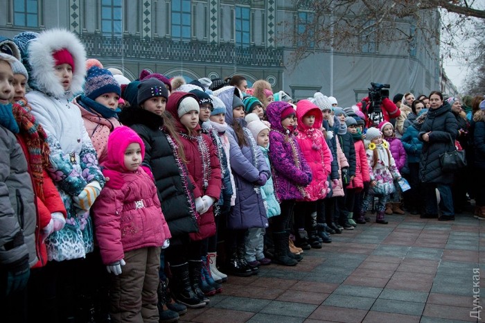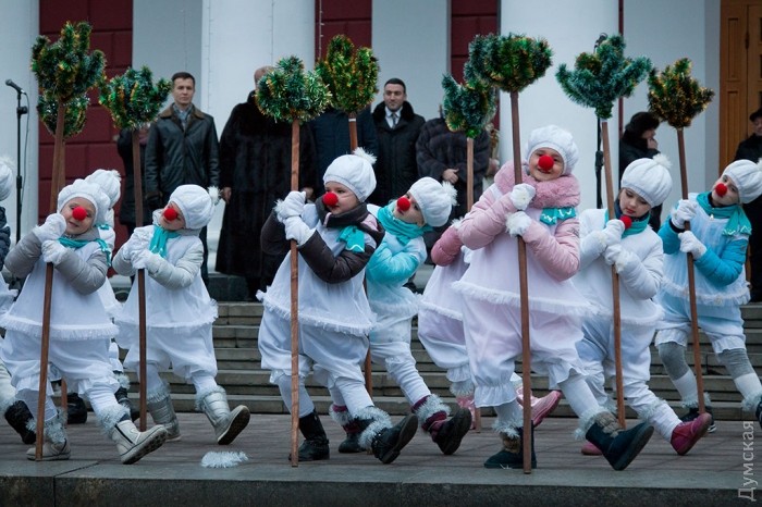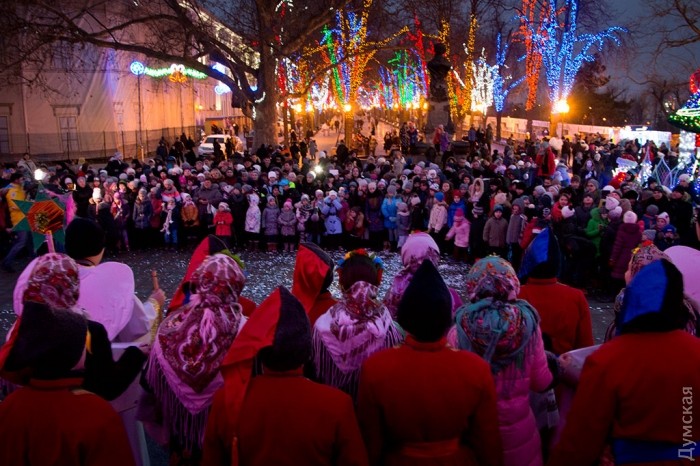 У зеленой красавицы прошел костюмированный праздник. Перед маленькими одесситами и их родителями выступили творческие коллективы города, пели колядки и устраивали конкурсы.