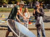 – Це сонячний концентратор, зроблений ентузіастами зі старої телевізійної тарілки. Тож, виходить, вона отримала друге життя та здатність ще довго служити людям. Зауважте: кава готується виключно завдяки сонячній енергії, без газу, електрики, вугілля чи дров. Маємо екологічно чистий сонячний напій.