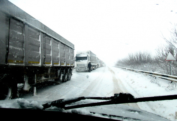 А близько опівночі на 303 км автодороги Київ-Одеса сильний снігопад спричинив чергове ускладнення руху, уже в сторону Одеси. Великогабаритний транспорт через обледеніння траси не зміг самостійно піднятися на крутий підйом. Таким чином, на кордоні Миколаївської та Одеської областей виник 2,5-кілометровий затор, у якому опинилося близько 100 одиниць техніки. У двох пасажирських автобусах перебувало 120 дітей. Працівники облавтодору з допомогою високопрохідної техніки найперше витягли автобуси з пасажирами і спрямували їх до Одеси.