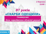 2 березня о 12-ій, на площі перед будівлею ОДА (проспект Шевченка, 4) урочисто відкривається ярмарок «Скарби Одещини», присвячений 87-ій річниці Одеської області.